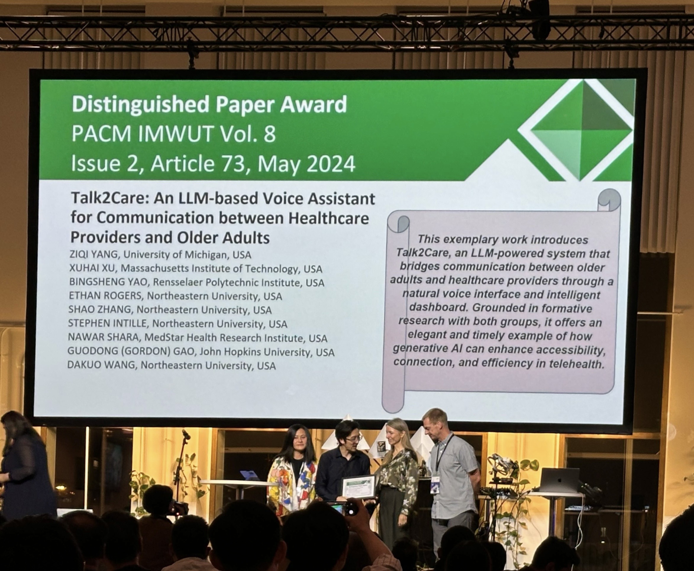 🏆 Our paper “Talk2Care: An LLM-based Voice Assistant for Communication between Healthcare Providers and Older Adults” won the IMWUT Distinguished Paper Award!